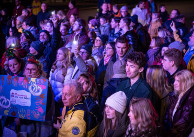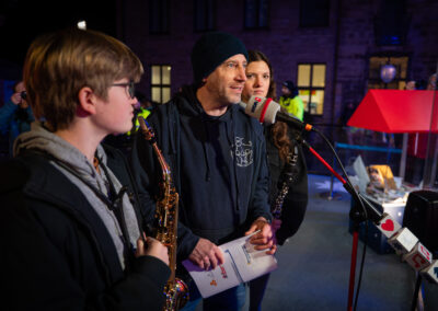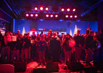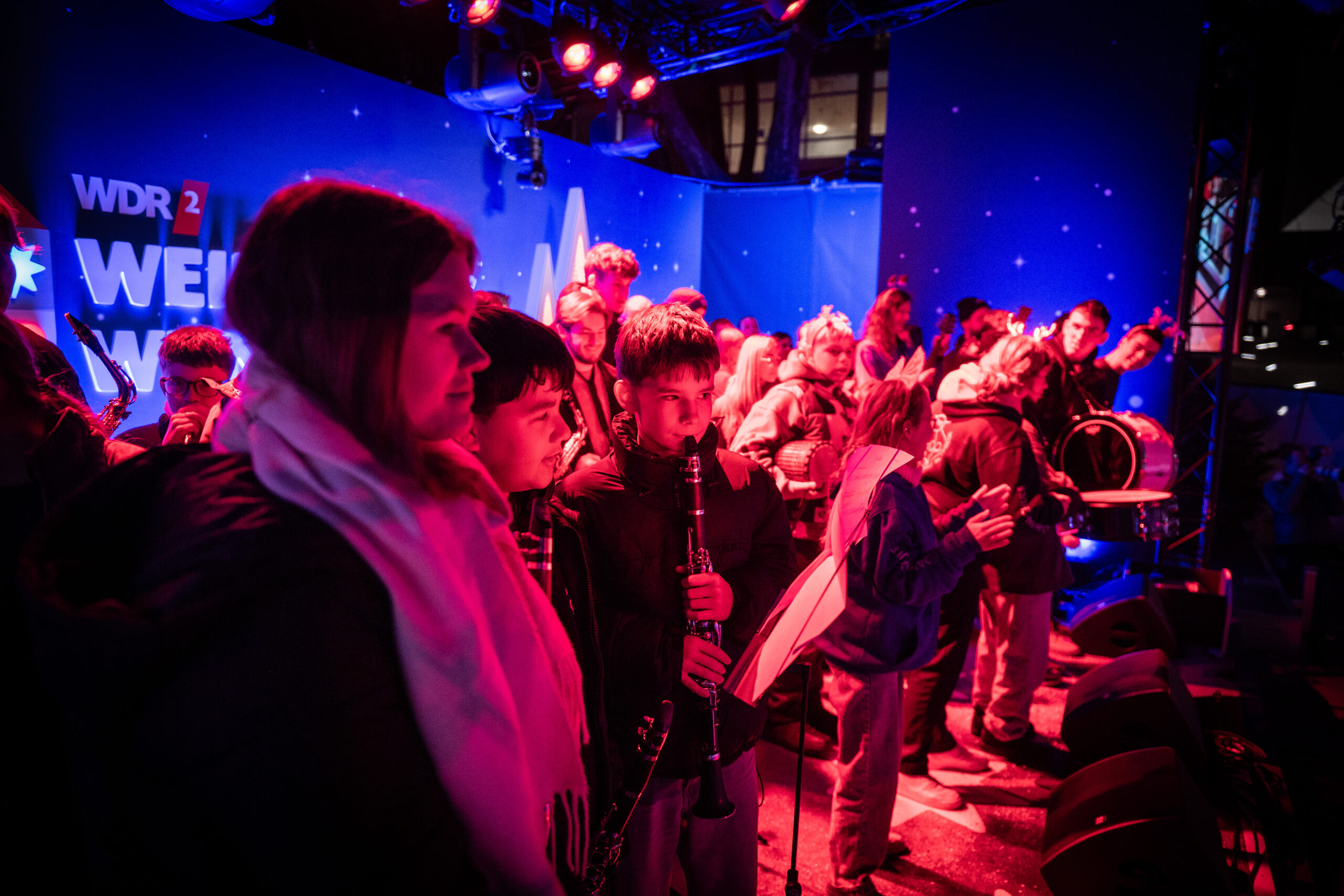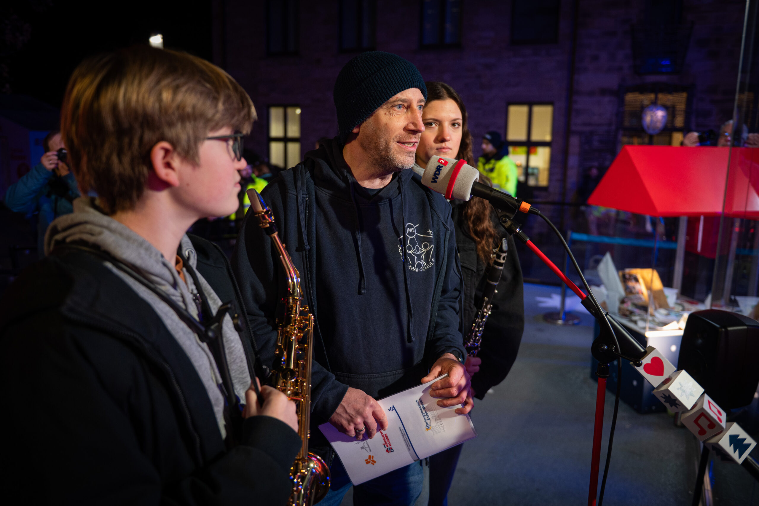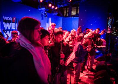 Fast wie in einer Geheimoperation haben am Dienstag um kurz nach 6 Uhr 140 Schülerinnen und Schüler der sieben Schulen im Bistum Essen zusammen mit ihren Lehrkräften die Bühne des WDR2-Weihnachtswunders und den Burgplatz bevölkert und gemeinsam das Steigerlied präsentiert. Zuvor hatten die Kinder und Jugendlichen gemeinsam in den Turnhallen des Schulzentrums am Stoppenberg in Essen übernachtet, um bereits um kurz nach 5 Uhr mit Bussen durch die schlafende Stadt zum Bischöflichen Generalvikariat zu fahren – und nach einer letzten Probe durch leere Büroflure zum Glashaus-Studio zu gehen, von dem aus der WDR noch bis Mittwochabend rund um die Uhr sendet.