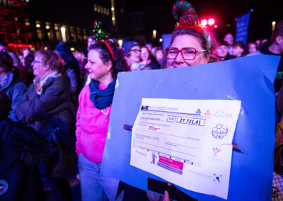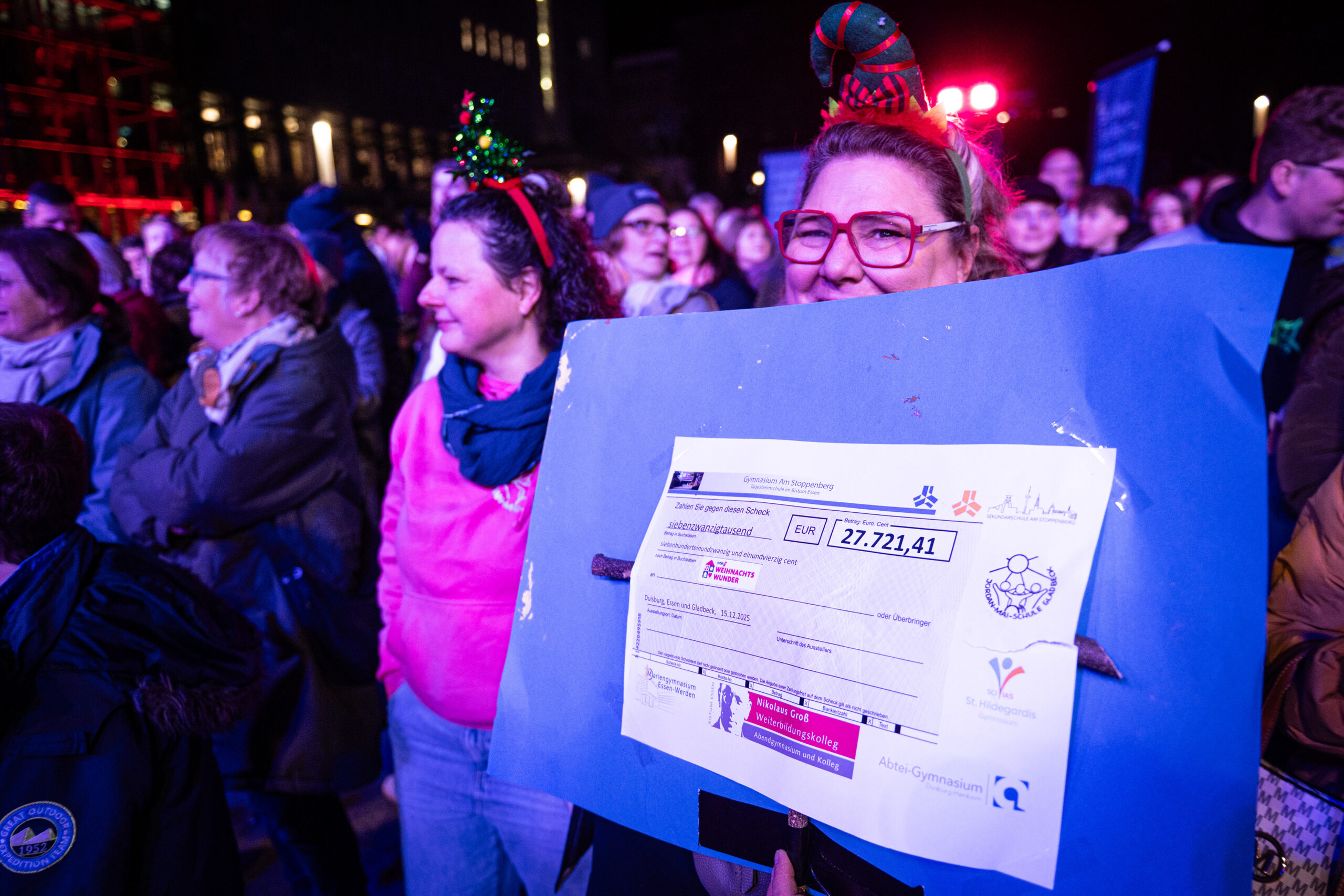 „Das ist Wahnsinn, was sind die denn schon so wach?“, jubelt Moderatorin Sabine Heinrich, als sie die volle Bühne und die bereits zu dieser Stunde dicht gefüllten Reihen vor ihrem Studio sieht. Zusammen mit den Jugendlichen Fenja und Jo berichtet Andreas Busch, Co-Leiter der Gladbecker Jordan-Mai-Schule, dass die sieben Schulen in Essen, Duisburg und Gladbeck schon seit dem Spätsommer planen, mit vielen kleinen Einzelaktionen an den Schulen Spenden zu sammeln und diese dann gemeinsam mit einem kreativen Event zu übergeben. So gab es Cafés bei Elternsprechtagen und Tagen der offenen Tür, Punsch- und Brezel-Verkäufe bei Martinszügen – und Jo erzählt von einer „Icebucket-Challenge“, bei der man gegen Eintrittsgeld jemandem zuschauen konnte, wie der sich einen Eimer Eiswasser über den Kopf schüttet. Insgesamt sind durch diese vielen Aktionen 27.721,41 Euro an Spenden zusammengekommen – ein Betrag, der Moderatorin Heinrich neben dem frühmorgendlichen Engagement der Kinder und Jugendlichen zu Tränen rührt. Mit der bereits gestern von Bischof Franz-Josef Overbeck und Peter Güllmann, Vorstandssprecher der Bank im Bistum Essen (BiB) überreichten Spende steigt das Gesamtspendenvolumen von Bistum und BiB damit auf 105.536,51 Euro.