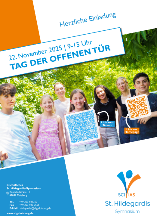 Liebe Eltern, liebe Schülerinnen und Schüler, wir freuen uns sehr Sie an unserem Tag der offenen Tür hier am St. Hildegardis Gymnasium begrüßen zu dürfen. Am 22.11.2025 von 9:00 bis 15:00 Uhr können Sie unsere Schule, unsere Lehrerinnen und Lehrer sowie unsere...