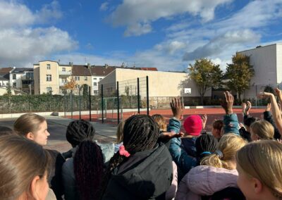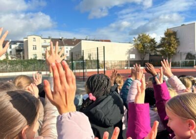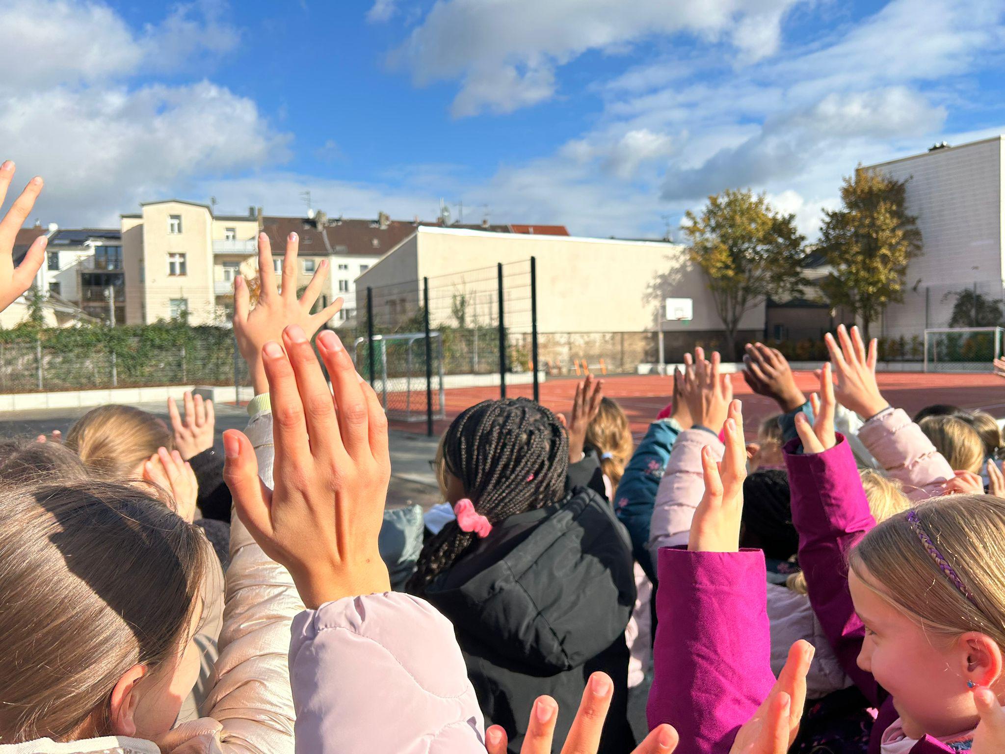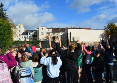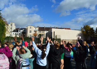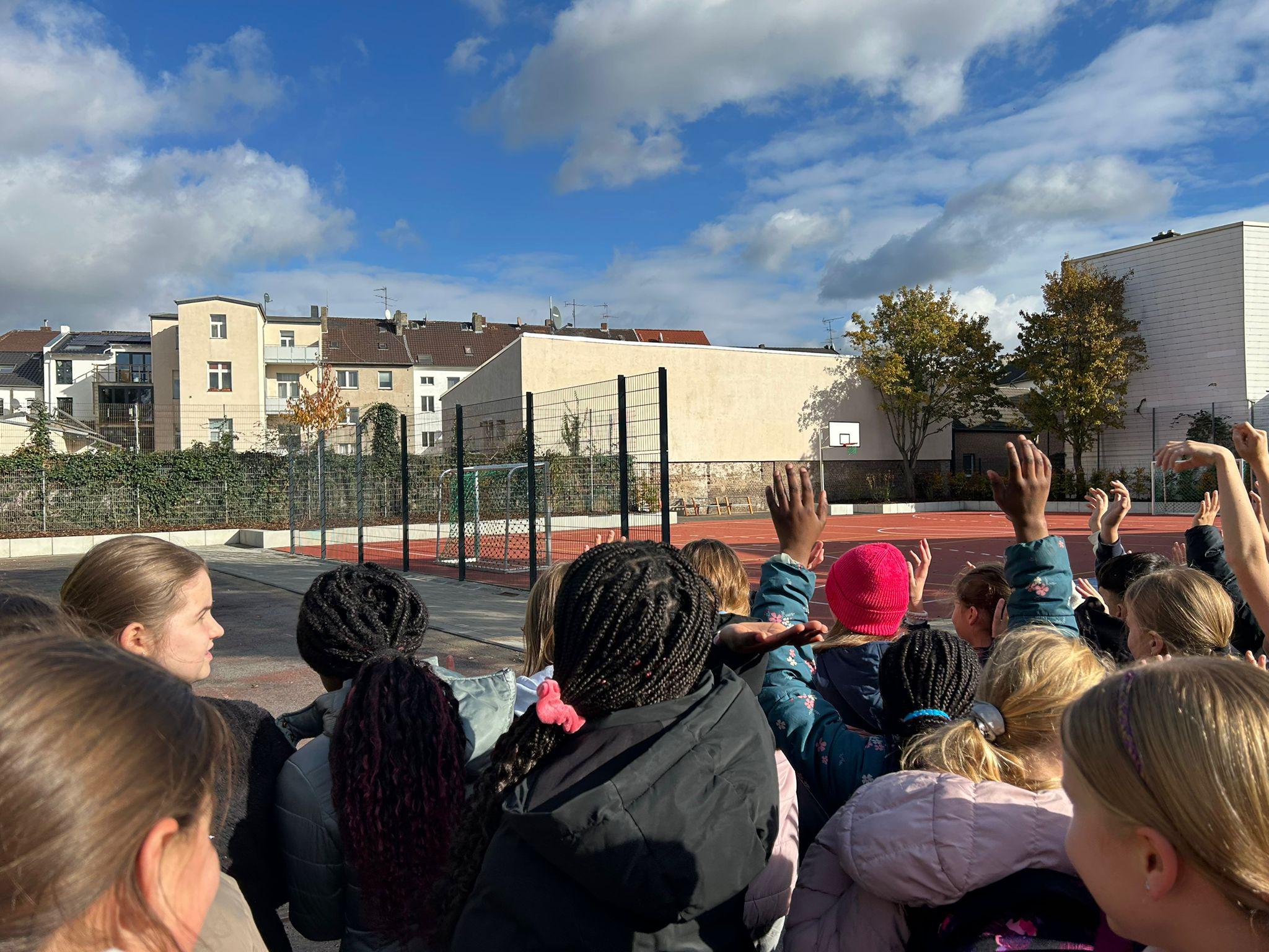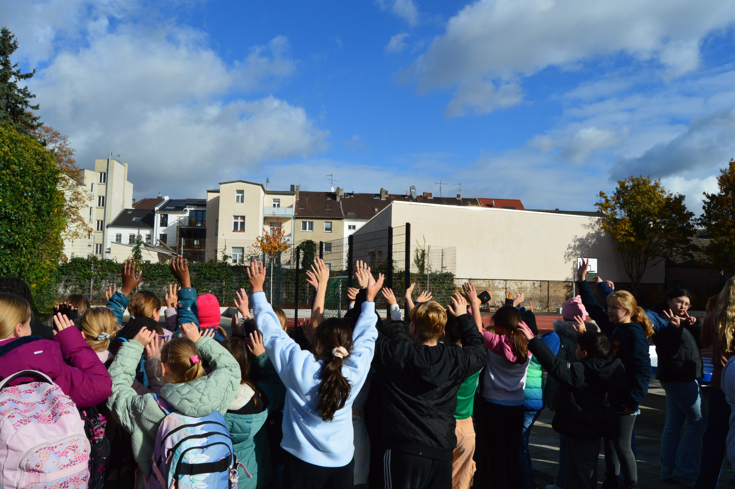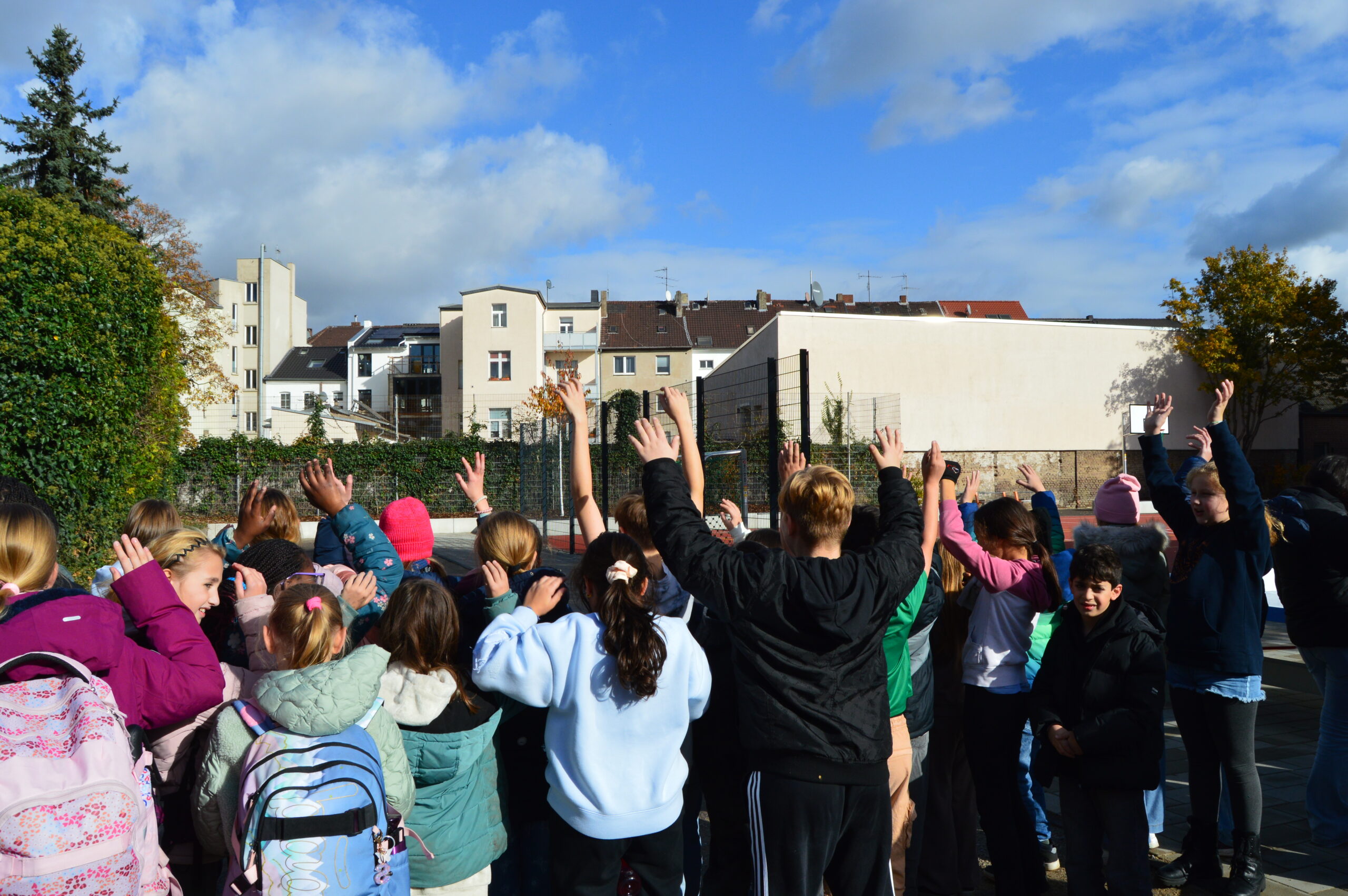 Locker machen bei der „Vocal-Break“ am Donnerstag, 23.5.2024 im Hildegradis-Gymnasium. Foto: Oliver Müller / Bistum Essen